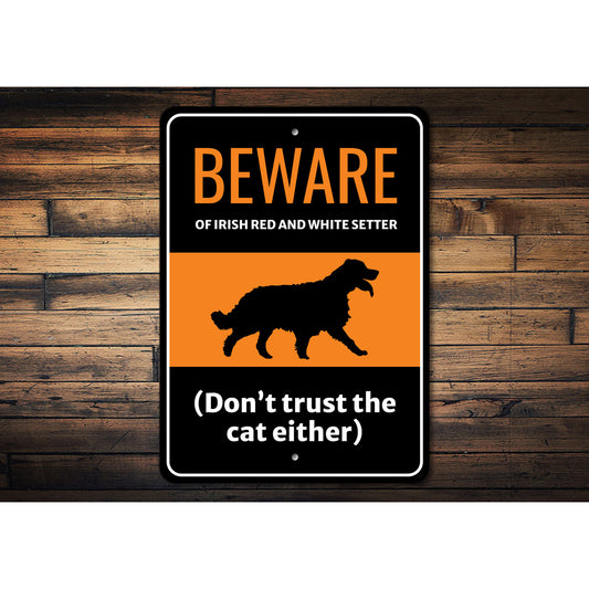 Beware Of Irish Red and White Setter Dog Don't Trust The Cat Either Sign
