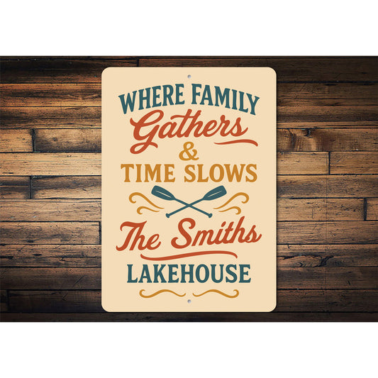 Where Family Gathers Time Slows Lakehouse Aluminum Sign