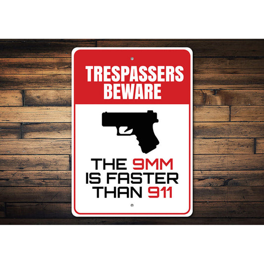 The 9mm is Faster Than 911 Beware Trespassers Metal Sign