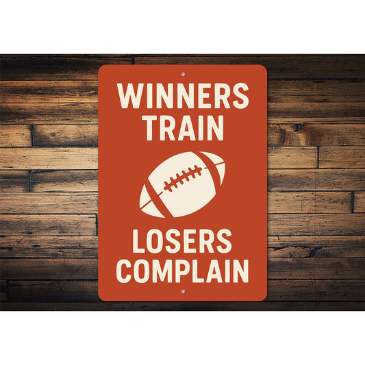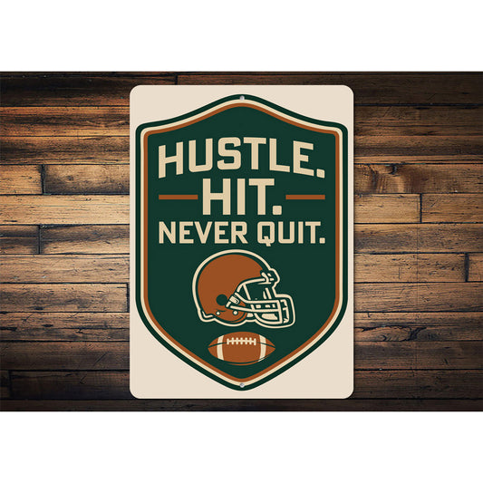 Hustle Hit Never Quit Motivational Football Aluminum Sign