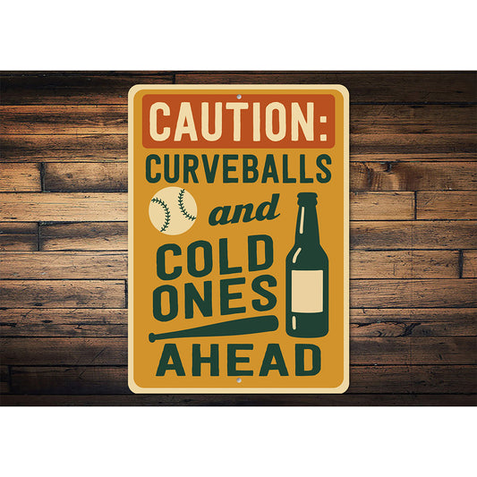 Caution: Curveballs & Cold Ones Ahead Aluminum Sign