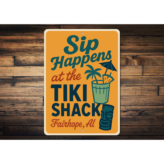 Vintage Sip Happens at the Tiki Shack Aluminum Sign